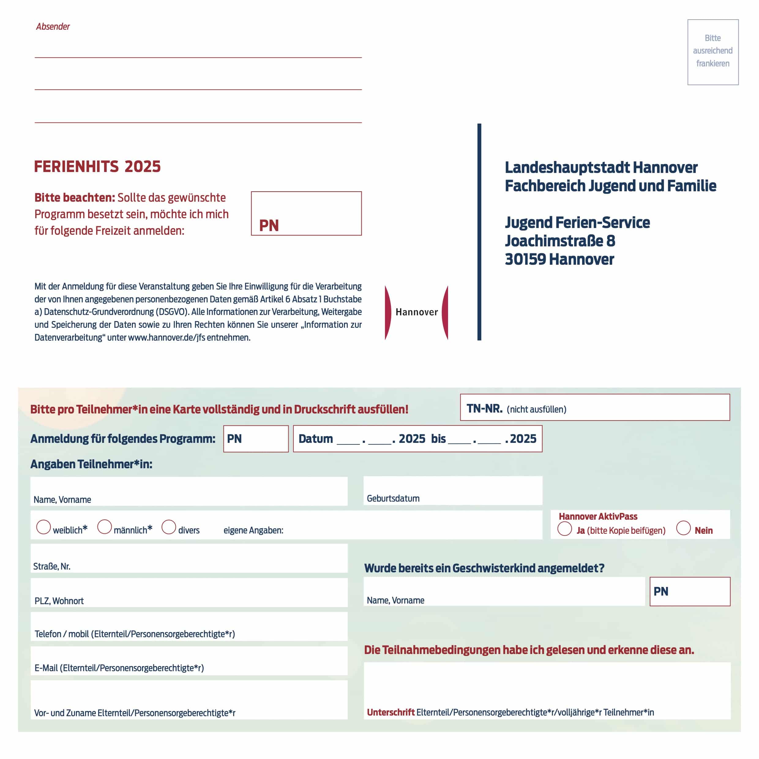 | Anschrift | Landeshauptstadt Hannover Fachbereich Jugend und Familie Jugend Ferien-Service OE 51.51.2 Joachimstr. 8 30159 Hannover |